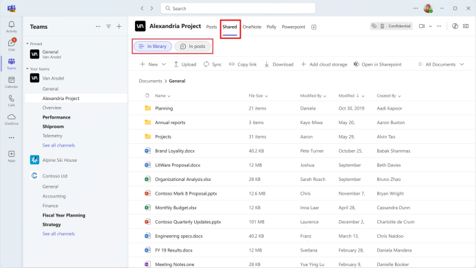 Within each Microsoft Team there are one, or more, channels where focused discussions, “Posts”, take place. Each channel has its own file folder where you can share files with that channel. To access that folder, go to the channel and click the Files tab. Note: The Files tab in channels will soon be called "Shared" (reference roadmap item below AND pictured above). In addition to files that are currently shown from the document library, this new experience will also show all the files and links shared in the channel conversations. This makes it easier to find content all in one place. The In posts ‘filter’ will display all files and links shared in channel posts.