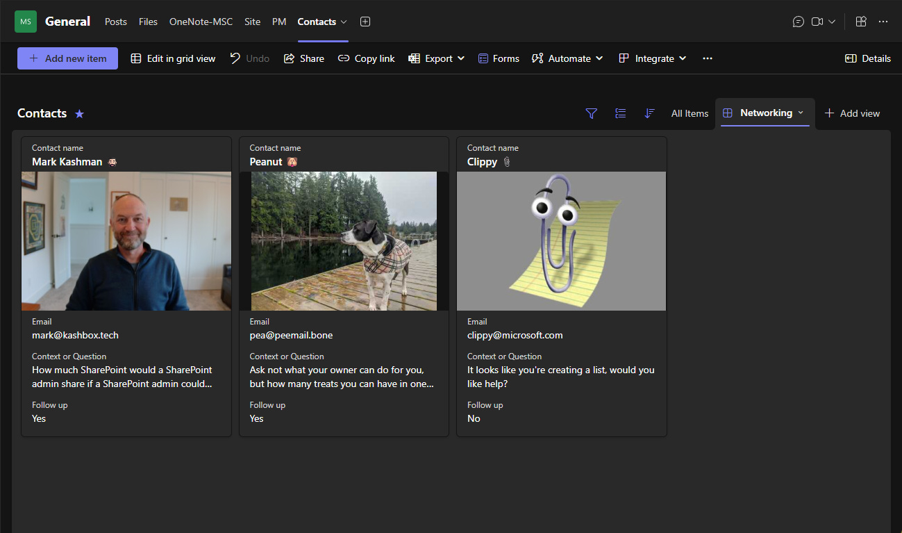 I used the Lists app within the “Add a tab” action - clicking the “+” button at the top of a Teams channel. You then give your new list a name, choose what columns you want (Contact name, Image (you can upload a photo or use your camera on mobile), Email, Context or Question, and Follow up (Yes/No)). And further, I was able to create a new Microsoft Lists form, a rule automation, and a new Gallery view (pictured) — again, all within Teams.