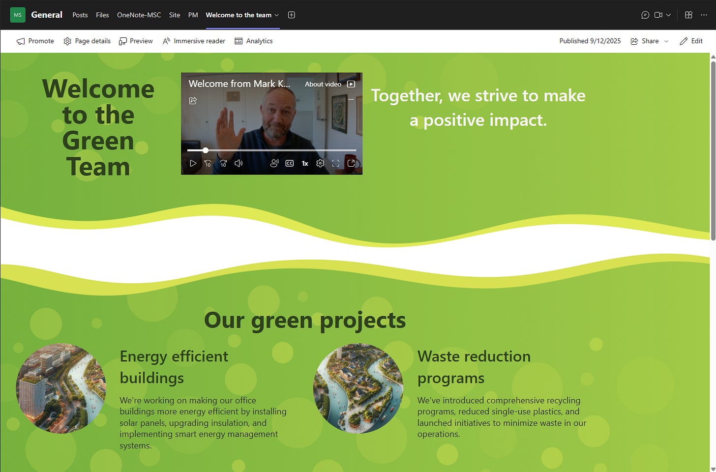 For the below example (screenshot), I first started in SharePoint — in the Teams team ‘connected SharePoint team site’ — to build out the Welcome page. I chose the new “Team Introduction” page template to jumpstart my creation. I then used Clipchamp to record a simple welcome video (all within the browser) and added that to the page. This template in particular uses the new flexible section layout, and I did just that, I moved a few things around, flexibly, until I got a nice “Welcome to the Green Team” page welcoming a new member of the Green Team. 🌱