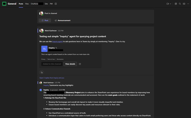 For the below example, I created a SharePoint agent called “Inquiry” and grounded it on two distinct document libraries filled with 20-30 documents — not the whole site. The use case is to best work as a team when supporting a specific client (redacted to hide customer name) based on all the intake materials and generated content - aka, all we know about them and the desired project outcomes. With the agent in place, in Teams, we can now ask questions, without having to do go to and hunt through those document libraries. The answers lie at our fingertips with an at-mention prompt to our friendly teammate, “Inquiry".”