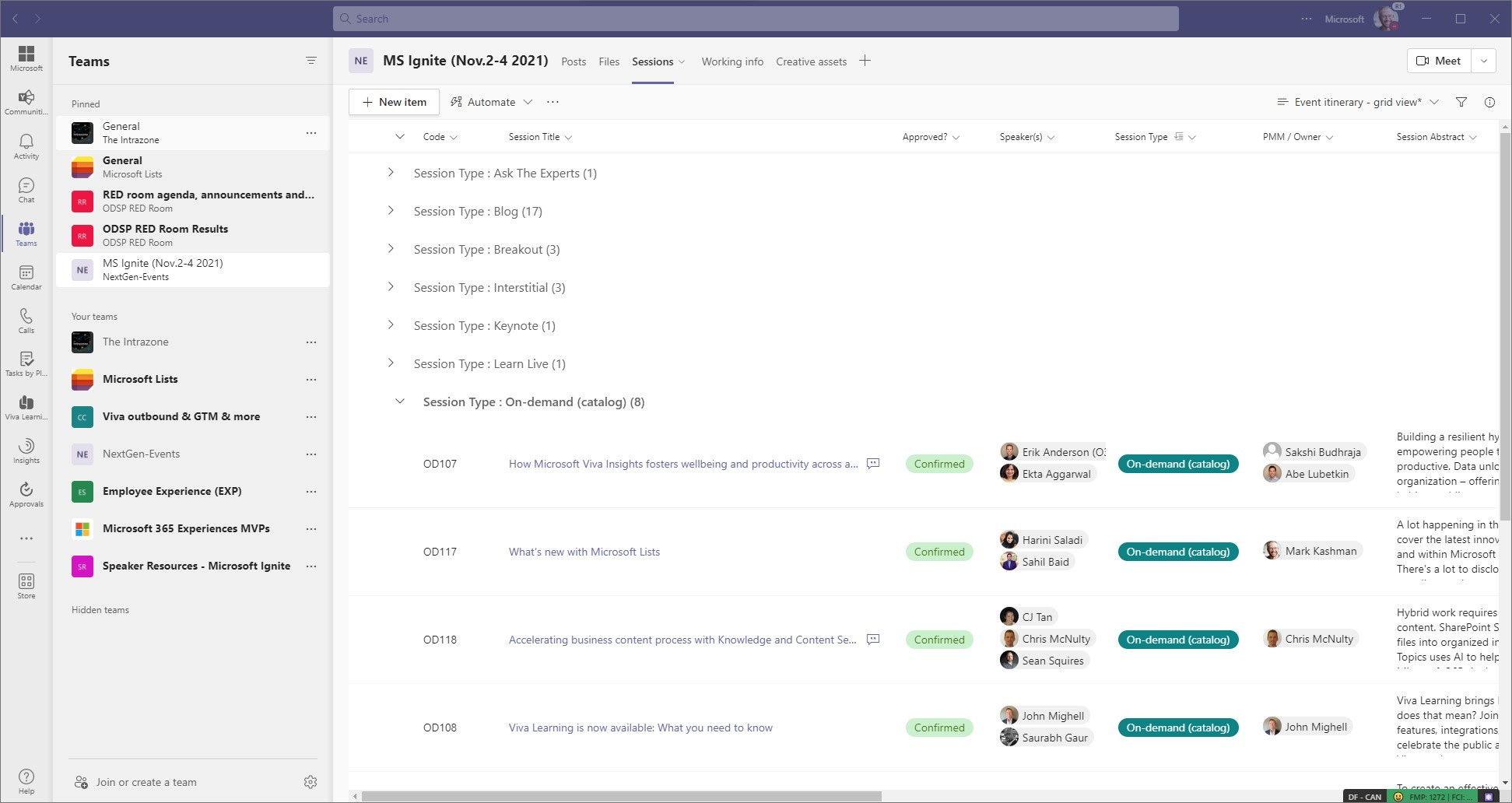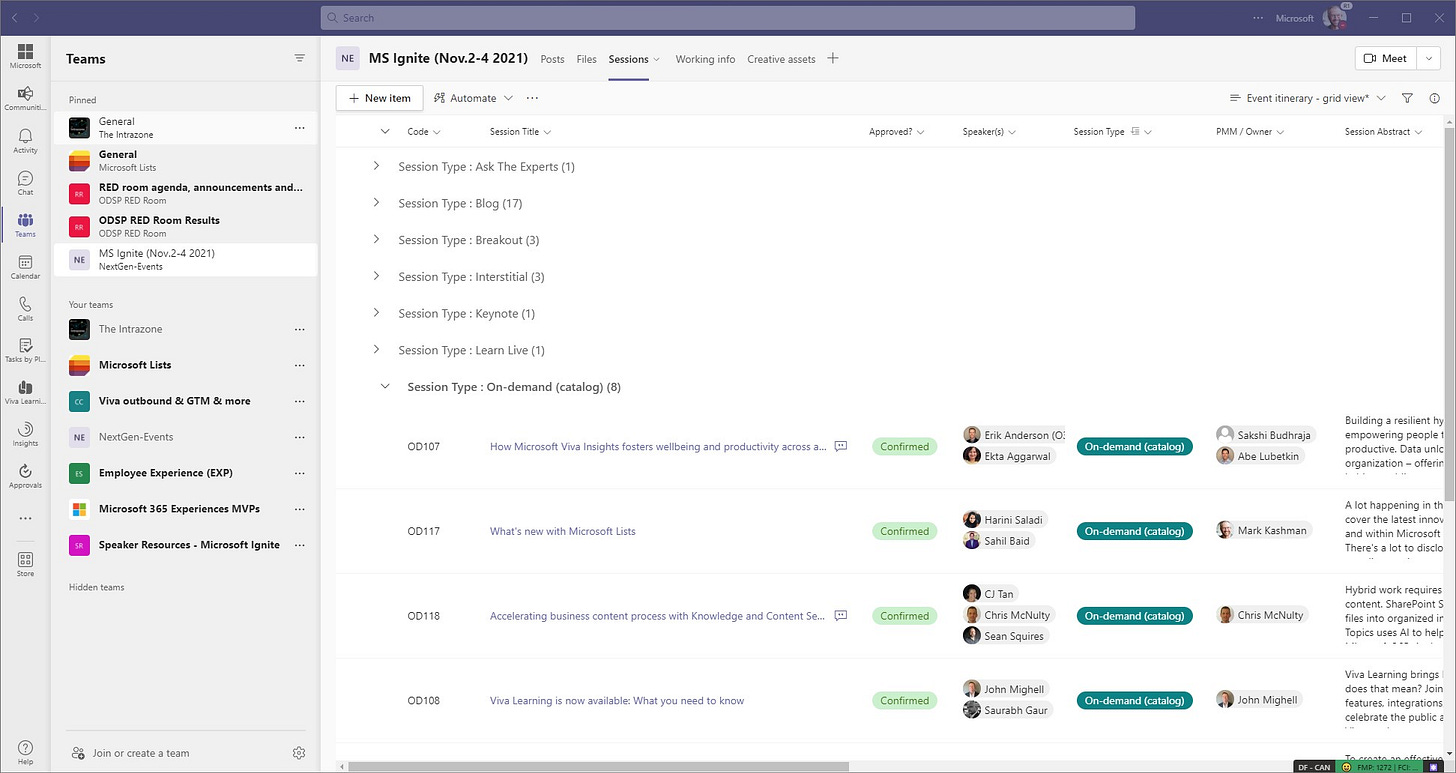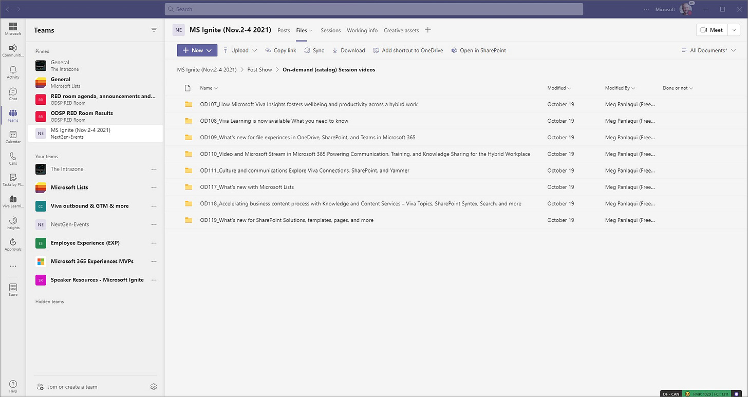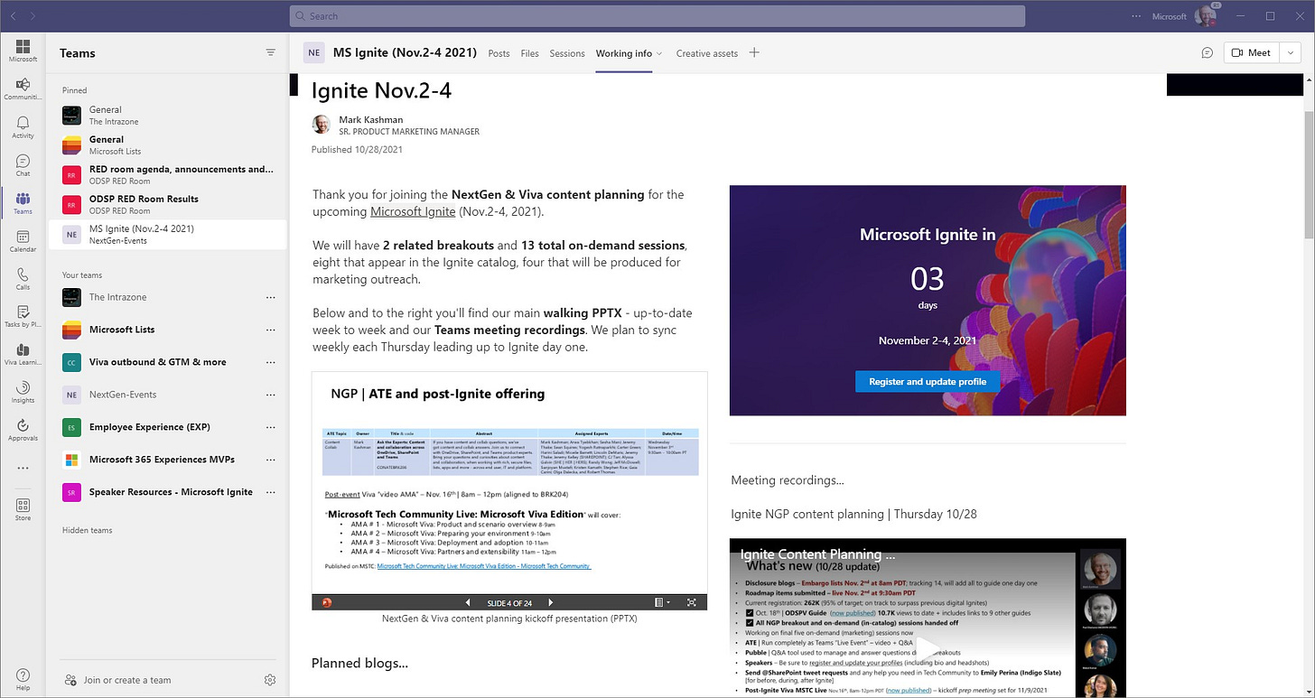 I was asked to corral our efforts across the SharePoint, OneDrive, Viva, Yammer, Stream, Planner teams. We put together the “NextGen-Events” team and brought together ~ 200 people. We focused most of our Ignite work in one Teams channel: “MS Ignite (Nov.2-4 2021)”; you’ll see these names in the screenshots below.