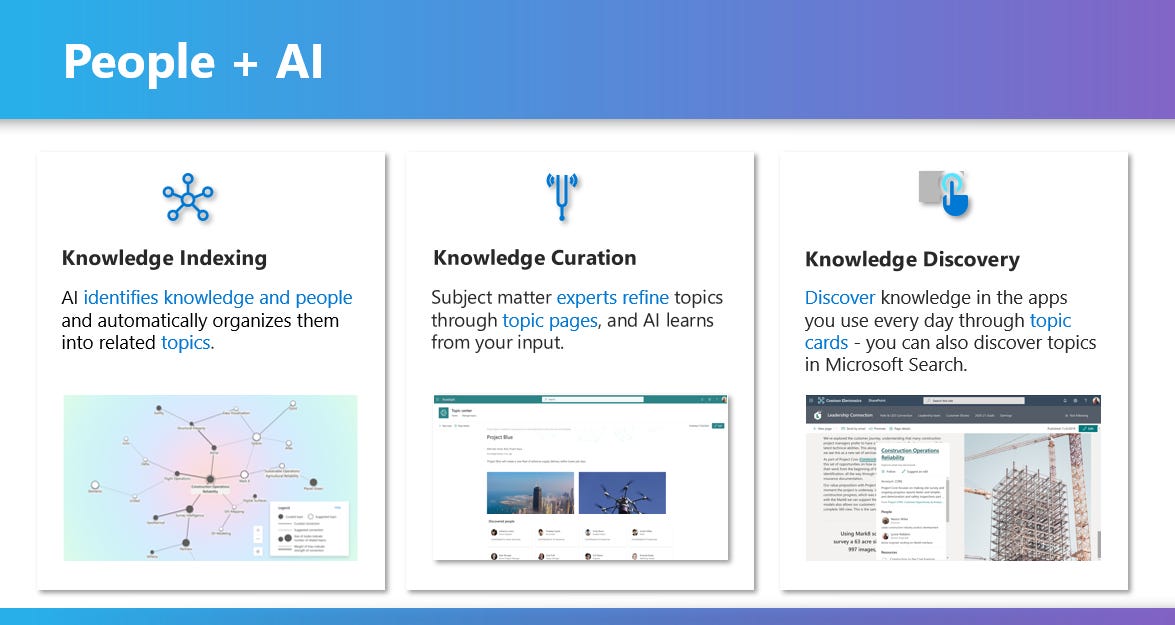 I suggest starting with the “Introducing Microsoft Viva Topics“ blog, and I’ll visually highlight my favorite aspect: People + AI. I called it out once above, and the below graphic articulates more of what’s behind this blend of sentient being and being sentient.