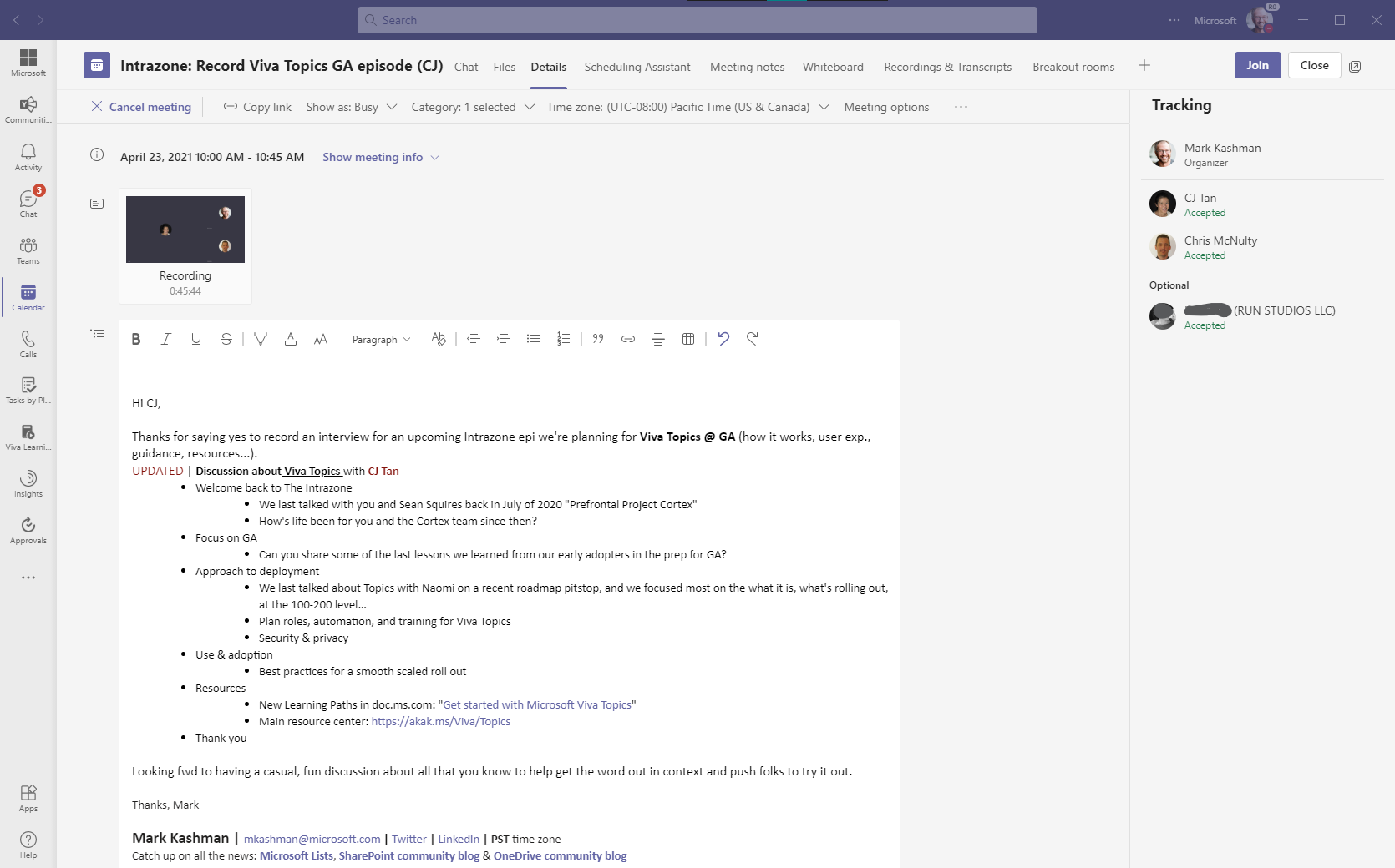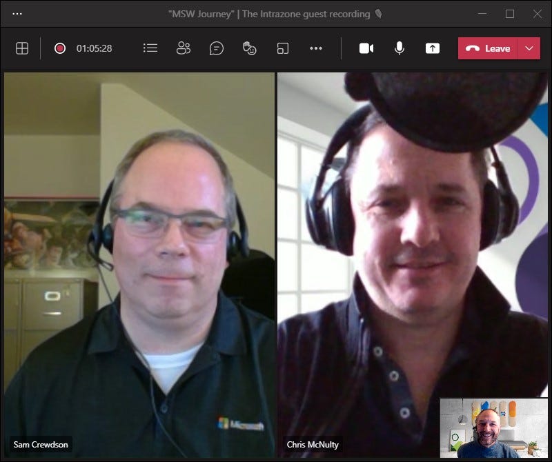 Similar to how schedule with our guests, we , too, grab 30 minutes to record our intro and outro, plus segments like Events, FAQs, and transitions. Thereās not much more to add here for what Teams offers, I just kept it in to say itās one of favorite time since itās usually just Chris and I catching up - heās busier than me, having a chat - half of which makes the edit, and getting a moment to laugh that i get to attribute as work. Iāll take that any day of the week⦠maybe thatās reason enough to become a weekly show⦠š¤.
