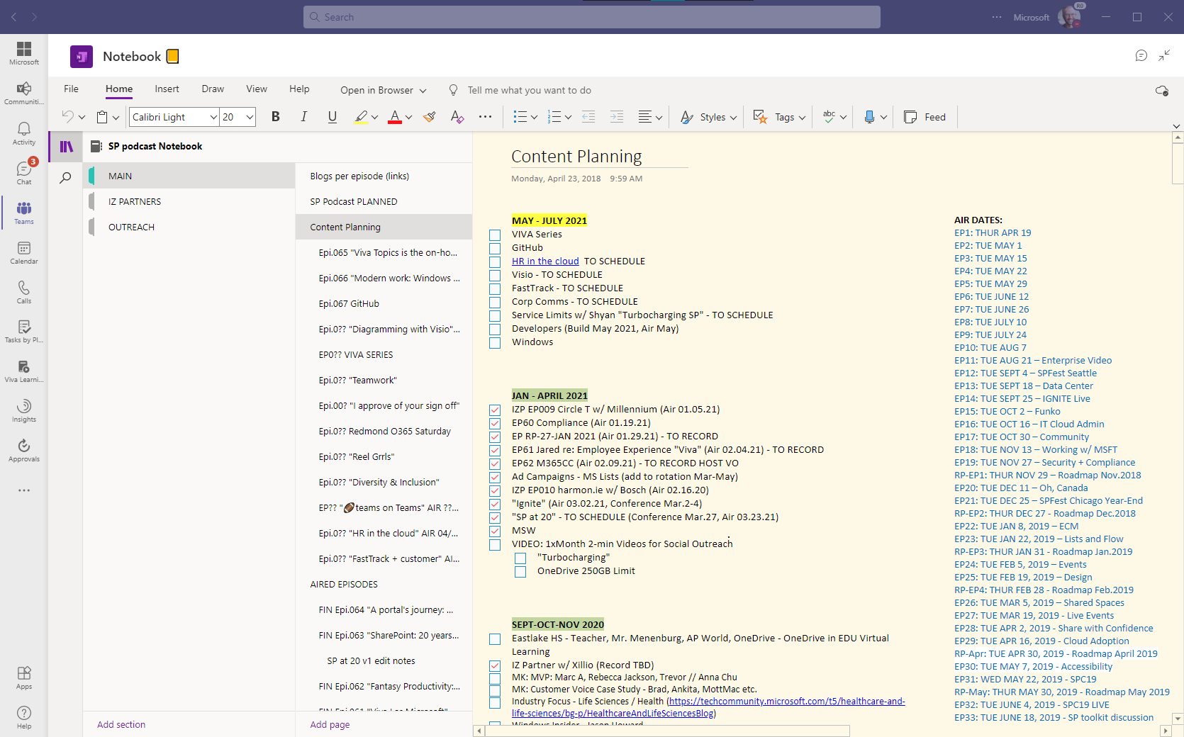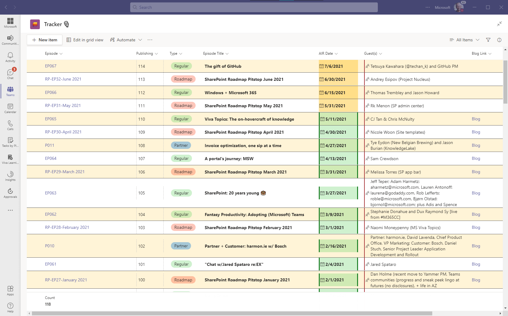 The Lists app in Teams makes it pretty easy. We keep it simple and practical: title, guest, air date, link, etc.. And when things change, Iāve set up a few rules so that I get notified and can course correct. For instance, Iāve one rule that sends me email when the Air Date changes - that usually means I need to pause or accelerate the related blog, or fill in with another episode.
